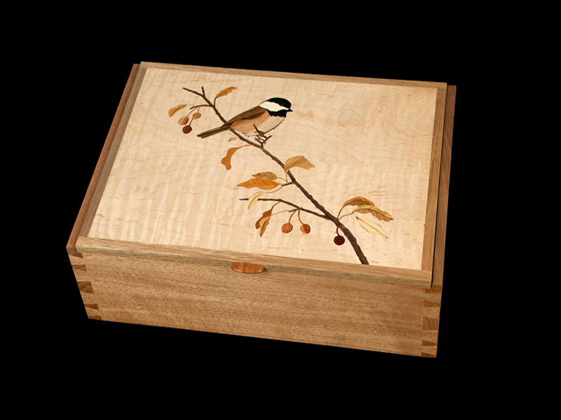 Box and sliding tray: butternut Marquetry woods include black limba, black walnut, California nutmeg, ebony, holly, mahogany, plum, shedua, sycamore, tulipwood Background wood: curly maple Dimensions: 12.75 x 8.5 inches