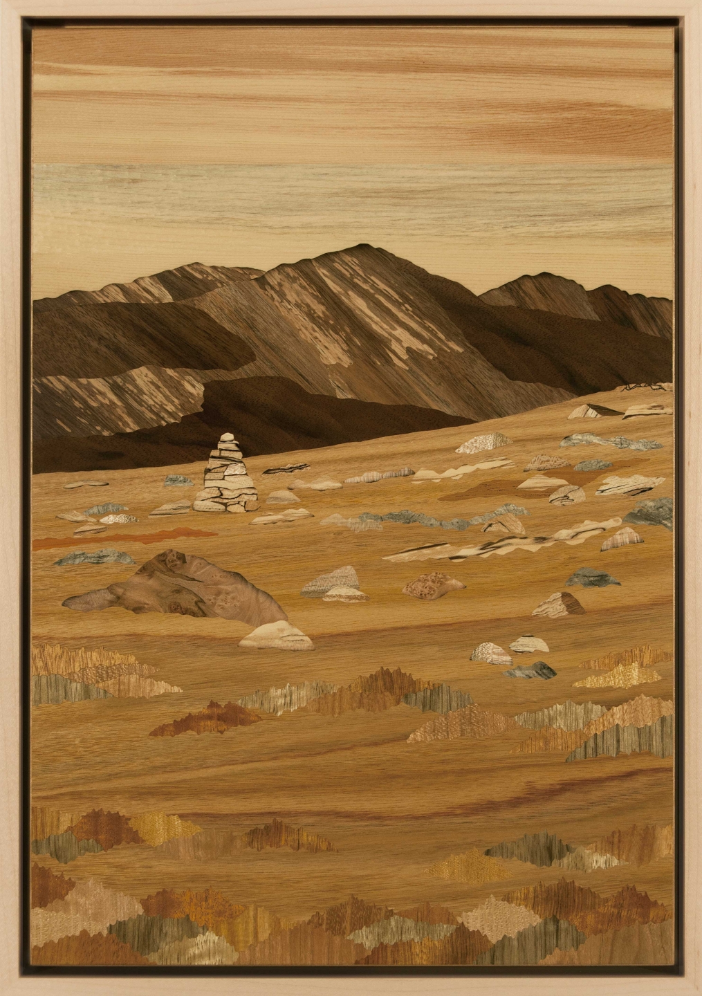 Marquetry woods include bigleaf maple, black cherry, black walnut, bubinga, canarywood, cherry burl, mahogany, Oregon walnut, pau rosa, spruce from a 2x4, spalted sugar maple, unidentified exotic wood (salvaged from a table)